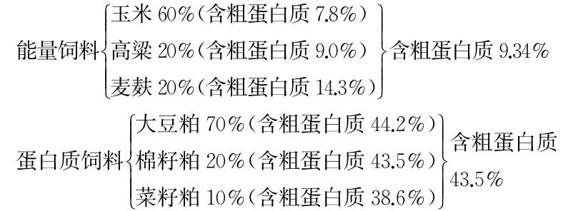 (1)两种以上饲料分组的配合 例如,要用玉米、高粱、小麦麸、大豆粕、棉籽粕、菜籽粕和矿物质饲料,为体重35~60kg的瘦肉型生长肥育猪配合含粗蛋白质为16.4%的混合料。需先根据经验和养分含量把以上饲料分成比例已定好的3组饲料,即混合能量料、混合蛋白质料和矿物质料。把混合能量料和混合蛋白质料当作两种饲料作交叉配合。计算方法如下: