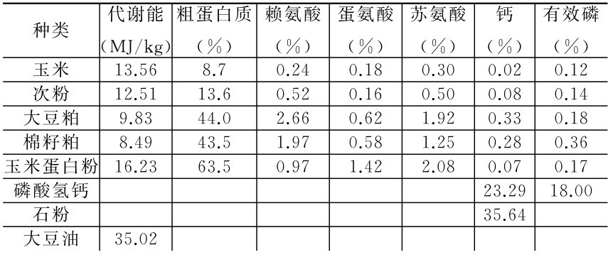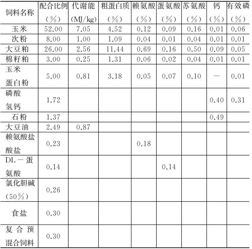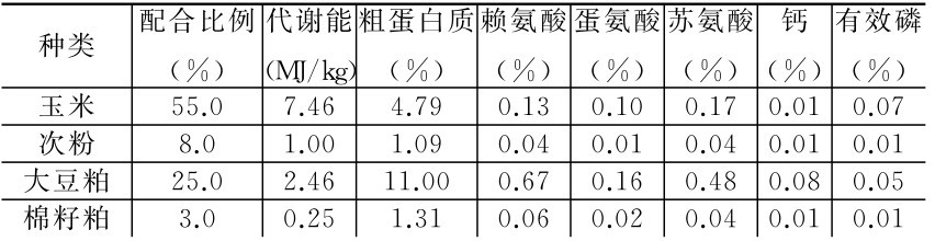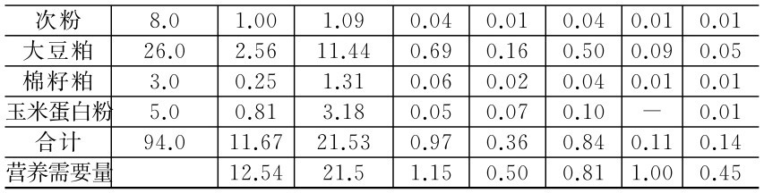 最终的配方为:玉米51.19%,次粉8%,大豆粕26%,棉籽粕3%,玉米蛋白粉5%,磷酸氢钙1.72%,石粉1.37%,大豆油2.49%,赖氨酸盐酸盐0.23%,DL-蛋氨酸0.14%,氯化胆碱(50%)0.26%,食盐0.30%,复合预混合饲料0.30%。