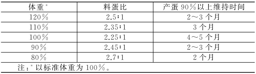 蛋鸡生产性能的发挥在很大程度上取决于育成鸡的培育,其中育成鸡的体重控制至关重要,育成期体重可一直影响整个产蛋期的体重(表48)。蛋鸡如果育成期体重偏低,会造成开产延迟、产蛋高峰期死淘率增加,全程总产蛋数减少,料蛋比升高,产蛋期采食量也小,不但蛋重下降,严重时产蛋率受到影响,产蛋高峰后急剧下降。育成期体重大同样影响到料蛋比和产蛋高峰期持续时间,育成期体重均匀度不好,鸡群产蛋高峰不高,蛋重大小不一,易诱发啄癖。