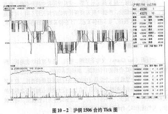 Tick图,也称闪电图,是按照时间顺序将期货合约的每一笔成交价格变动依次标注出来并连线形成。Tick图可以标示出一段时间内所有成交价格及其变动幅度。