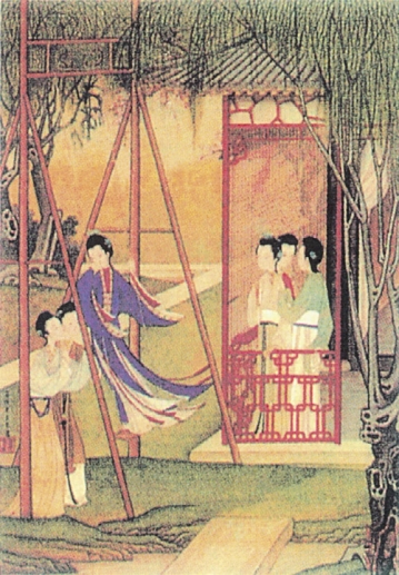 古时的秋千多用树桠枝为架,再拴上彩带做成。后来逐步发展为用两根绳索加上踏板的秋千。打秋千不仅可以增进健康,而且可以培养勇敢精神,至今为人们特别是儿童所喜爱。