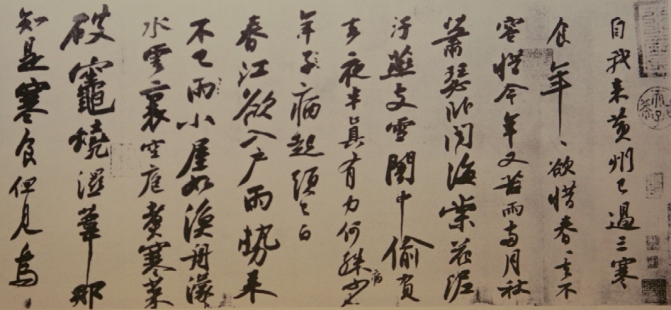 《黄州寒食诗帖》,纸本,25行,共129字,是苏轼行书的代表作。这是一首遣兴的诗作,是苏轼被贬黄州第三年的寒食节所发的人生之叹。诗写得苍凉多情,表达了苏轼此时惆怅孤独的心情。此诗的书法也正是在这种心情和境况下有感而出的。通篇书法起伏跌宕,光彩照人,气势奔放,而无荒率之笔。《黄州寒食诗帖》在书法史上影响很大,被称为“天下第三行书”,也是苏轼书法作品中的上乘。