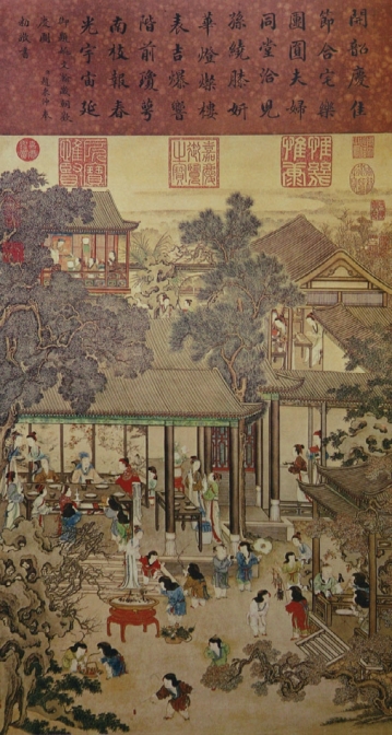 清明交三月节,前两日谓之“寒食”。京师人从冬至后数起,至一百五日。便是此日,家家以柳条插于门上,名曰“明眼”,凡官民不论小大家,子女未冠笄者,以此日上头。寒食第三日,即清明节,每岁禁中命小内侍于阁门用榆木钻火,先进者赐金碗、绢三匹。宣赐臣僚巨烛,正所谓“钻燧改火”者,即此时也。禁中前五日,发宫人车马往绍兴攒宫朝陵。宗室南班,亦分遣诸陵,行朝享礼。向者从人官给紫衫、白绢、三角儿青行缠,今亦遵例支给。至日,亦有车马诣赤山诸攒,并诸宫妃王子坟堂,行享祀礼。官员士庶,俱出郊省坟,以尽思时之敬。车马往来繁盛,填塞都门。宴于郊者,则就名园芳圃,奇花异木之处;宴于湖者,则彩舟画舫,款款撑驾,随处行乐。此日又有龙舟可观,都人不论贫富,倾城而出,笙歌鼎沸,鼓吹喧天,虽东京金明池未必如此之佳。