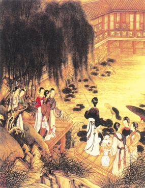 酒贪欢,不觉日晚。红霞映水,月挂柳梢,歌韵清圆,乐声嘹亮,此时尚犹未绝。男跨雕鞍,女乘花轿,次第入城。又使僮仆挑着木鱼、龙船、花篮、闹竿等物归家,以馈亲朋邻里。杭城风俗,侈靡相尚,大抵如此。