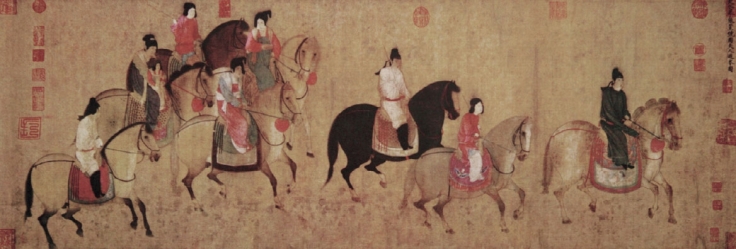 唐代宫廷画家张萱所作的《虢国夫人游春图》,绢本设色,宽52厘米,长148厘米。此画描绘了唐玄宗宠妃杨玉环的姐姐虢国夫人和秦国夫人及其侍从在春天出游的情景。作品表现了贵妇人们游春时悠闲从容的欢悦情绪,从一个侧面反映了当时上层社会的人们奢侈淫逸的享乐生活。画面里出游的行列呈前松后紧组合型的构图,统一中有着变化,使画面充满着节奏感和韵律感。