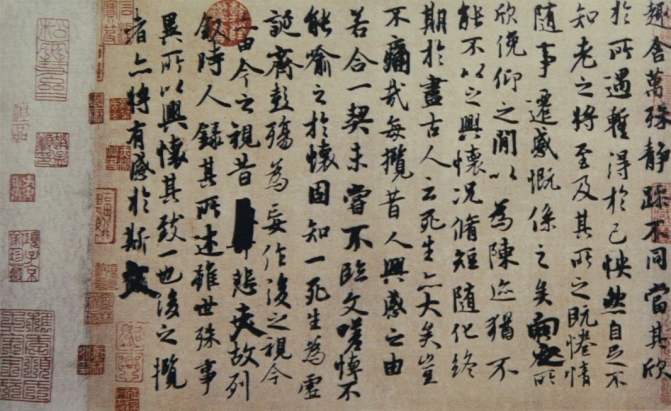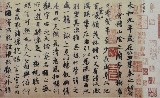 《兰亭集序》有“天下第一行书”之誉,是中国历史上最杰出的书法家王羲之的代表作品。东晋永和九年(公元353年)三月三日,王羲之与谢安、孙绰等四十余人在山阴兰亭举行祓禊活动。参加雅集的多为当世名士,大家一道曲水流觞,饮酒赋诗,事后这些诗篇汇编成集,《兰亭集序》就是为这个诗集写的序文。总览全篇,行笔不激不厉,挥洒自如,收放有度,点画从容而神气内敛。自始至终流露着一种从容不迫、潇洒俊逸的气度,给人以高雅、清新、华美、蕴藉的艺术感受。从形质到神韵均成为后人学习行书的典范。《兰亭集序》书文并美,表现了晋人特有的超然玄远的深情与风采,为后人所称慕与景仰。