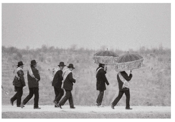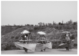 两个丑婆子(俗称“害婆娘”)走在最前列,一个手握笤帚逢人就扫,另一个专在被扫人的额头点上红点。