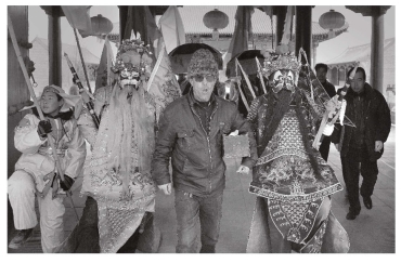 平凉社火特有的春官走在队伍的前列,他们打扮独特,以欢快的锣鼓为背景即兴发挥说诗。
