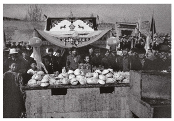 会的供桌上燃酥油灯,供品多为大馒头、酥油等。