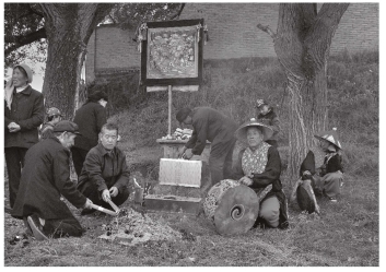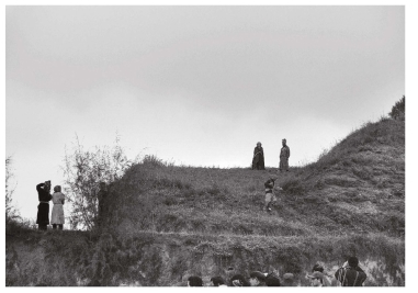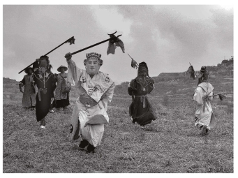 四名跳会的能手身着八卦衣,手握开天斧,在田野里傩舞祈祷。
