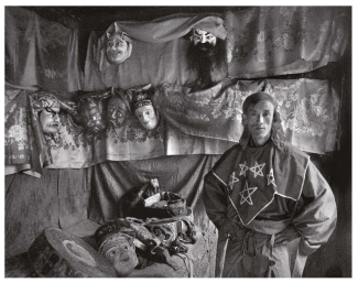 存放傩具的房间里,一位准备卸妆的扮演者。