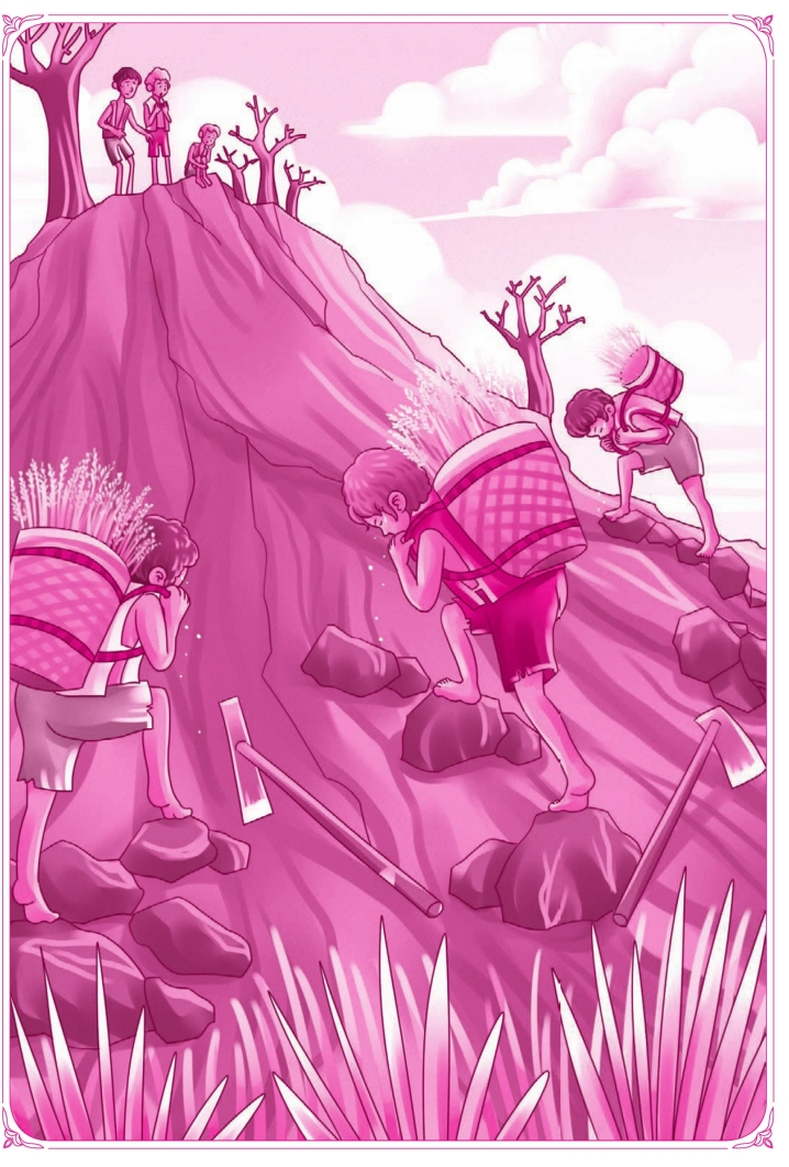 拿锄头的人仍旧把耕种出来的东西分给柔弱的人吃,仍旧每人一份。可是要分给他们,不像先前那样便当了,要背着稻呀麦呀,爬上土石堆。土石堆越来越高,稻呀麦呀变得越来越重,压得他们背都弯了,胸口几乎碰着了膝盖。