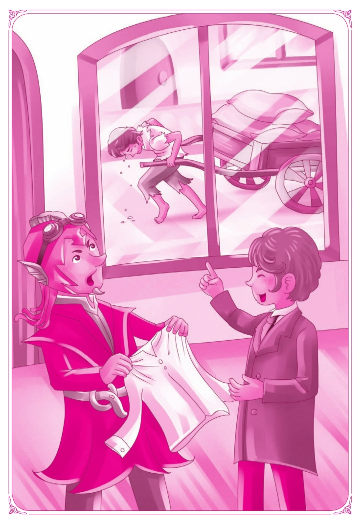 需要漂亮衣服的少年走到机器旁边,一按机关,就得到了一套漂亮的衣服。他穿上衣服就去游山玩水了。