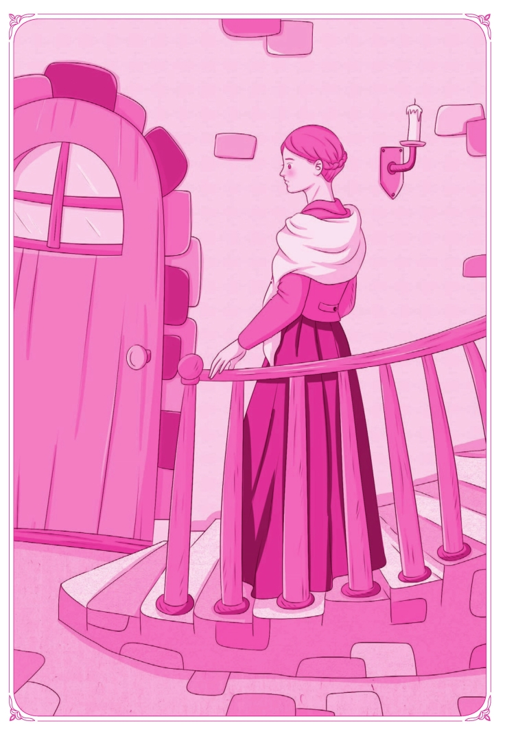 我床边的椅子上放着我所有的衣物,又干净又干燥。我的黑丝上衣挂在墙上,泥沼的印迹已经洗去,潮湿留下的褶皱已经熨平,看上去很不错了;我的鞋子和袜子已洗得干干净净,很是像样了。房间里有梳洗的工具,有一把梳子和一把刷子,可把头发梳理整齐。我疲乏地挣扎了一番,每隔五分钟休息一下,我终于穿好了衣服。因为消瘦,衣服穿在身上很宽松,不过我用披肩掩盖了这个不足。于是,我再一次清清爽爽、体体面面了。没有一丝我最讨厌、并很降低我身份的尘土和凌乱。我扶着栏杆,爬下了石头楼梯,来到了一个低矮窄小的过道,摸索着进了厨房。