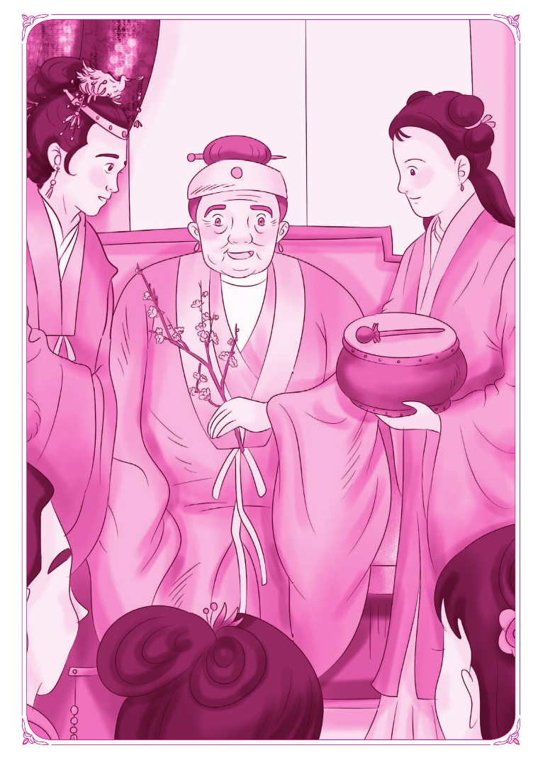 一时,梨香院的教习带了文官等十二个人,从游廊角门出来。凤姐儿因见贾母十分高兴,便笑道:“趁着女先儿们在这里,不如叫他们击鼓,咱们传梅,行一个‘春喜上眉梢’的令如何?”贾母笑道:“这是个好令,正对时对景。”忙命人取了一面黑漆铜钉花腔令鼓来,与女先儿们击着,席上取了一枝红梅。贾母笑道:“若到谁手里住了,吃一杯,也要说个什么才好。”凤姐儿笑道:“依我说,谁像老祖宗要什么有什么呢。我们这不会的,岂不没意思。依我说也要雅俗共赏,不如谁输了谁说个笑话罢。”众人听了,都知道他素日善说笑话,最是他肚内有无限的新鲜趣谈。今儿如此说,不但在席的诸人喜欢,连地下服侍的老小人等无不欢喜。那小丫头子们都忙出去,找姐唤妹的告诉他们:“快来听,二奶奶又说笑话儿了。”众丫头们便挤了一屋子。于是戏完乐罢,贾母命将些汤点果菜与文官等吃去,便命响鼓。那女先生们皆是惯的,或紧或慢,或如残漏之滴,或如迸豆之疾,或如惊马之乱驰,或如疾电之光而忽暗。其鼓声慢,传梅亦慢;鼓声疾,传梅亦疾。恰恰至贾母手中,鼓声忽住,贾母便讲了一个。讲完,又击起鼓来。小丫头们只要听凤姐儿的笑话,便悄悄地和女先生说明,以咳嗽为记。须臾传至两遍,刚到了凤姐儿手里,小丫头子们故意咳嗽,女先生便住了。