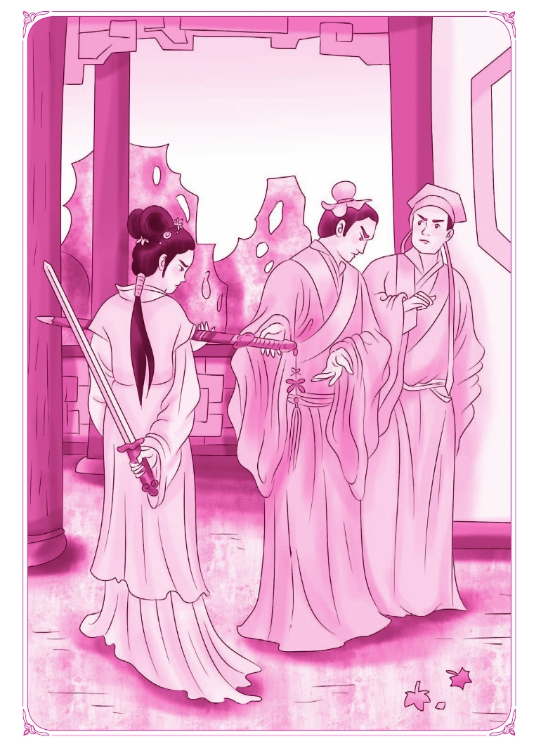 贾琏正在新房中,闻得湘莲来了,喜之不禁,忙迎了出来,让到内室与尤老娘相见。湘莲只作揖称老伯母,自称晚生,贾琏听了诧异。吃茶之间,湘莲便说:“客中偶然忙促,谁知家姑母于四月间订了弟妇,使弟无言可回。若从了老兄背了姑母,似非合理。若系金帛之订,弟不敢索取,但此剑系祖父所遗,请仍赐回为幸。”贾琏听了,便不自在,还说:“定者,定也。原怕反悔所以为定,岂有婚姻之事,出入随意的?还要斟酌。”湘莲笑道:“虽如此说,弟愿领责领罚,然此事断不敢从命。”贾琏还要饶舌,湘莲便起身说:“请兄外坐一叙,此处不便。”那尤三姐在房内明明听见。好容易等了他来,今忽见反悔,便知他在贾府中得了消息,自然是嫌自己淫奔无耻之流,不屑为妻。今若容他出去和贾琏说退亲,料那贾琏必无法可处,自己岂不无趣。一听贾琏要同他出去,连忙摘下剑来,将一股雌锋隐在肘内,出来便说:“你们不必出去再议,还你的定礼。”一面泪如雨下,左手将剑并鞘送与湘莲,右手回肘只往项上一横。可怜