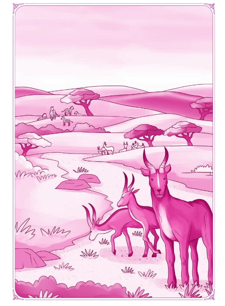 他静静地躺了一会儿,接着把目光越过那片灼热而炫目的平原,眺望灌木丛的边缘。在黄色的平原上,有几只野羊显得又小又白。在远处,他看见一群斑马,映衬着葱绿的灌木丛,显得白花花的。这是一个舒适宜人的营地,大树遮阴,背倚山岭,有清洌的水。附近有一个几乎已经干涸的水穴,每当清晨时分,沙松鸡就在那儿飞翔。