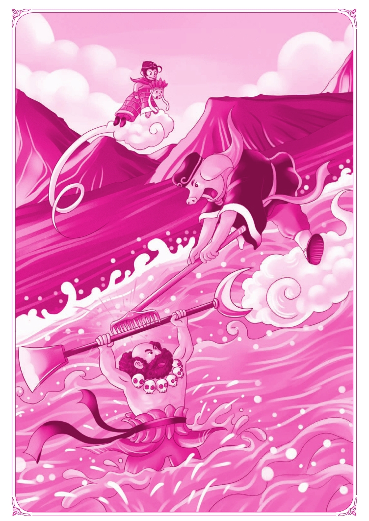 好八戒,抹抹脸,抖擞精神,分开水路,依然又下至窝巢。那怪见八戒执钯下来,便跳出去当头拦住。只见钯来杖架逞英雄,声如霹雳动鱼龙。八戒又使个佯输计,拖了钯走。那怪随后又赶来,拥波捉浪,赶至崖边。