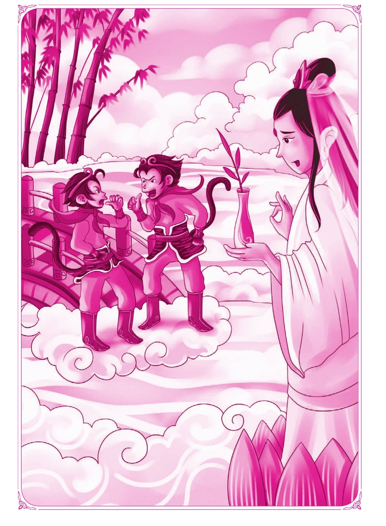 菩萨暗念真言,两个一齐喊疼,都抱着头在地下打滚,只叫:“莫念,莫念!”菩萨不念,他两个又一齐揪住,照旧嚷斗。菩萨无可奈何,叫声“孙悟空”,两个一齐答应。菩萨道:“你当年官拜‘弼马温’,大闹天宫时,神将皆认得你,你且上界去分辨回话。”