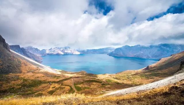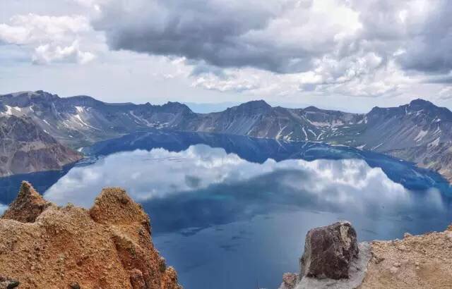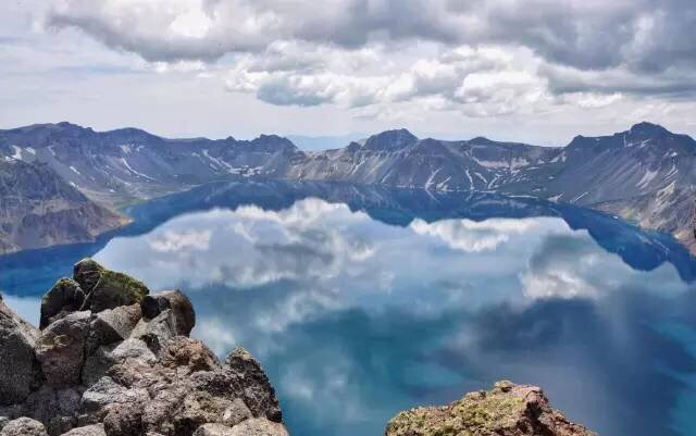 到了秋天,天空仿佛特别高远,长白山天池平静的就像一面镜子,反射出湛蓝的天池全貌,把天池周围的山峰的倒影都清楚地显示出来,美轮美奂。