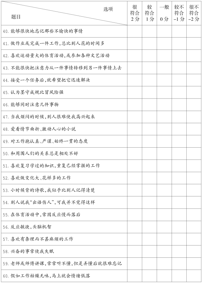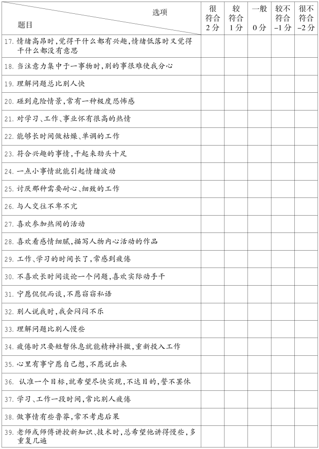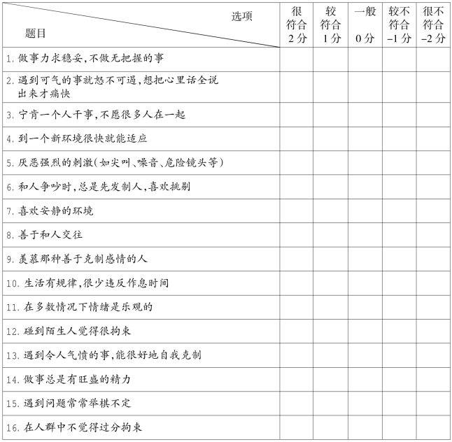 2.如果某一项或两项得分都在20以下,10分以上,其他各项得分较低,则为该项一般气质。例如,一般多血质、一般胆汁—多血质混合型。