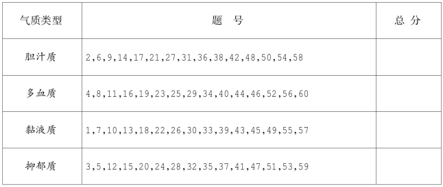 气质量表又称“陈会昌六十气质量表”。该量表是由山西省教科院陈会昌等编制,共60题,每种气质类型15题,测量出4种气质类型:胆汁质、多血质、黏液质和抑郁质。