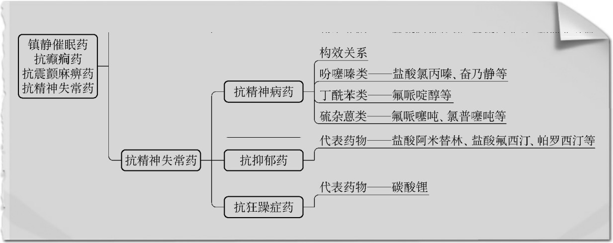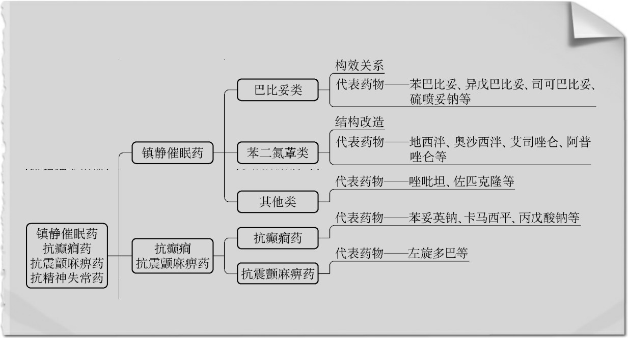 注:上述各类药物的学习内容包括此类药物的发展、分类、结构改造和构效关系及化学结构、结构特点、理化性质和临床应用等知识点。