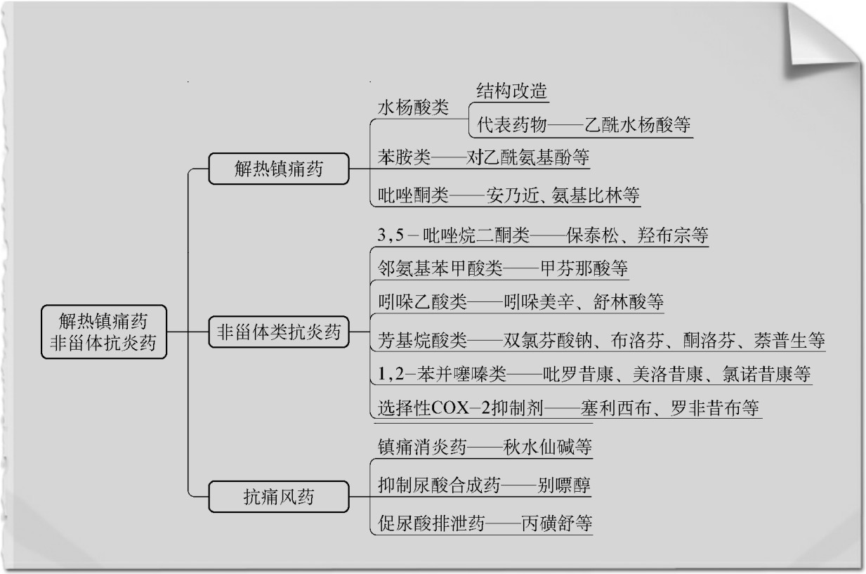 注:上述各类药物的学习内容包括此类药物的发展、分类、结构改造和构效关系及化学结构、结构特点、理化性质和临床应用等知识点。