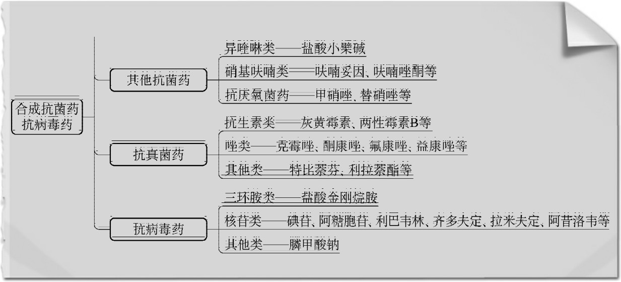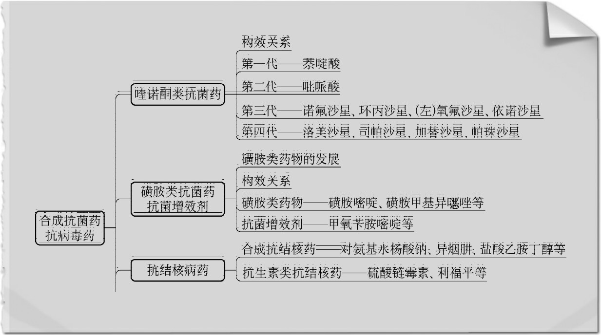 注:上述各类药物的学习内容包括此类药物的发展、分类、结构改造和构效关系及化学结构、结构特点、理化性质和临床应用等知识点。