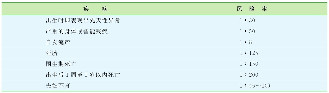 再现风险(recurrence risk)是遗传病在临床上常遇到的问题之一。所谓再现风险,是指患者罹患的遗传病在家系亲属中再发生的风险率。影响再现风险的因素较多,故很难对遗传病的再现风险制定出一个标准。例如,一方面,Huntington舞蹈症是一种常染色体显性遗传病,按理论推测,患者子女的再现风险为50%。但它的发病年龄多在35岁以后,随着子女年龄的增长,再现风险也逐渐下降,通过建立年龄与再现风险的发病曲线,可以得到不同年龄个体的再现风险。另一方面,任何一种遗传病都有一个群体再现风险的基线(baseline),即任何一次妊娠所生子女的群体风险率有些是根据疾病的遗传方式决定的,有些是基于经验概率得出的(表1-3)。