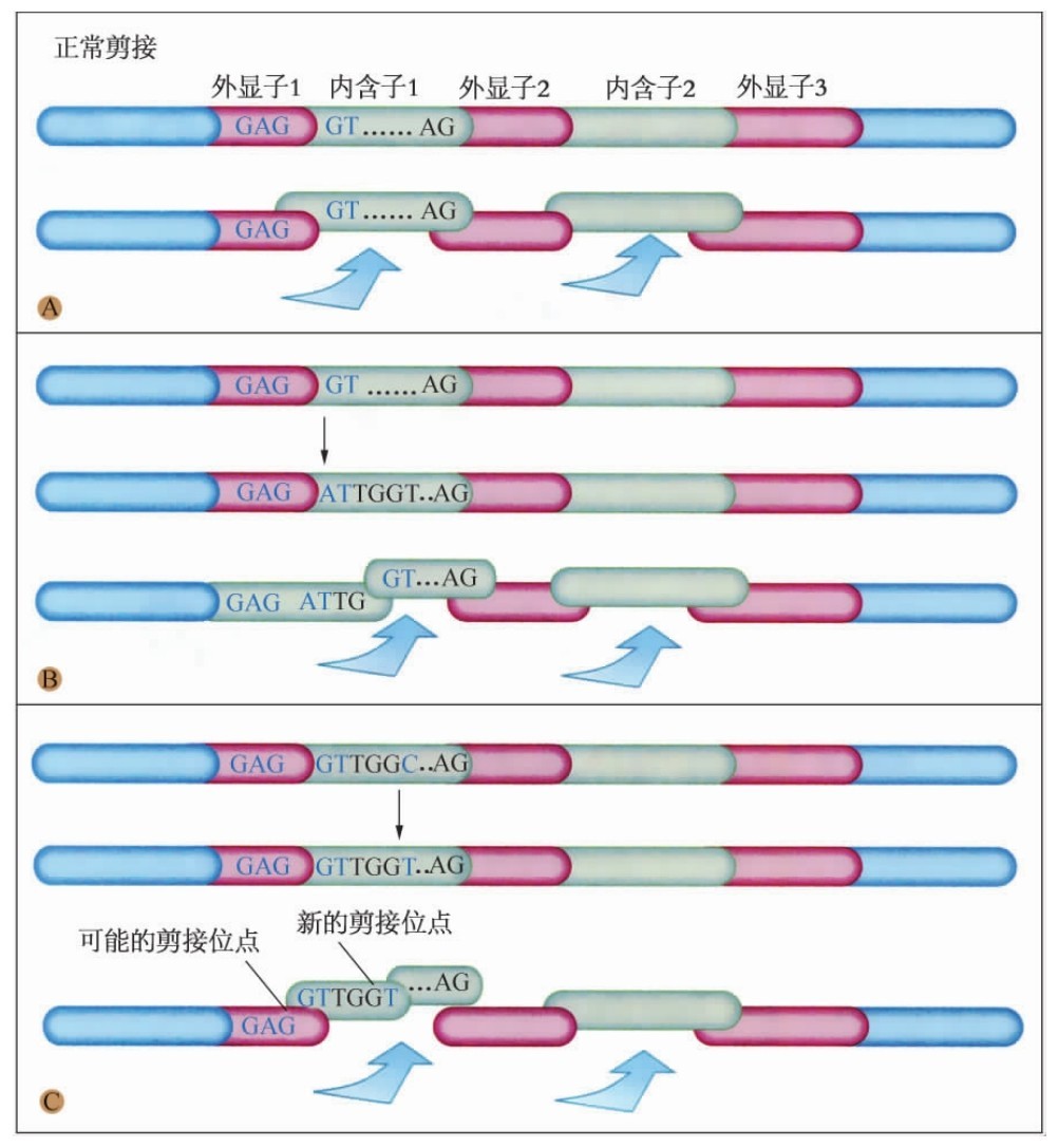 (5)剪接位点突变(splice-site mutation):突变或发生在内含子5′GT(供位)或发生在内含子3′AG(受位)处,导致剪接异常(图2-9)。这在肿瘤及一些遗传病中可见到。