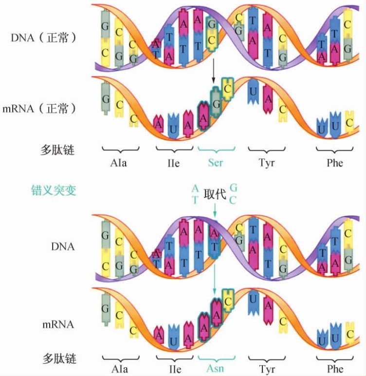 (3)错义突变(missense mutation):是指编码某种氨基酸的密码子经碱基替换以后,变成编码另一种氨基酸的密码子,从而使多肽链的氨基酸种类和序列发生改变。错义突变的结果通常能使多肽链丧失原有功能。许多蛋白质的异常就是错义突变所引起的,如人血红蛋白分子的异常即是如此(图2-8)。