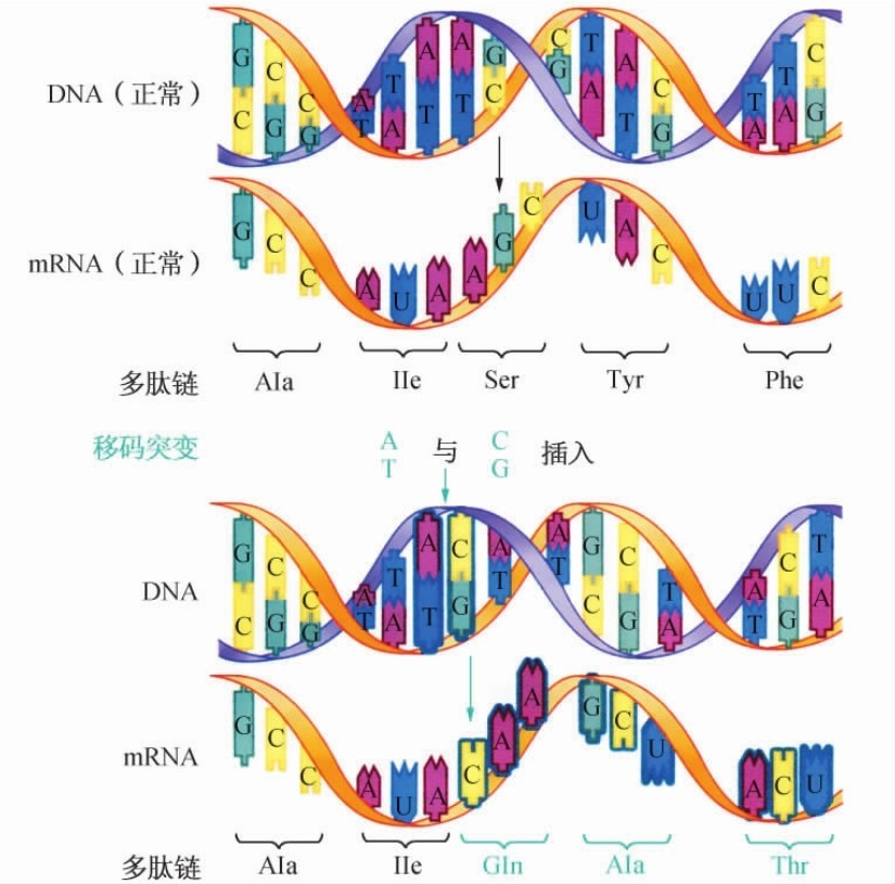 2.移码突变 移码突变是指由于基因组DNA链中插入或缺失1个或几个碱基对,从而使自插入或缺失的那一点以下的三联体密码的组合发生改变,进而使其编码的氨基酸种类和序列发生变化。