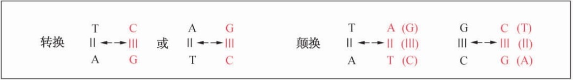 1.碱基替换 碱基替换是指DNA链中碱基之间互相替换,从而使被替换部位的三联体密码意义发生改变。碱基替换又可分为转换(transition)和颠换(transversion)。转换是指一种嘌呤-嘧啶对被另一种嘌呤-嘧啶对所替换;颠换是一种嘌呤-嘧啶对被另一种嘧啶-嘌呤对所替换(图2-6)。碱基替换所产生的效应包括以下几种情况。
