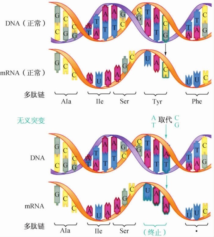 (4)终止密码突变(terminator codon mutation):是指DNA分子中的某一个终止密码突变为编码氨基酸的密码,从而使多肽链的合成至此仍能继续下去,直至下一个终止密码为止,形成超长的异常多肽链。如人血红蛋白的α链可因终止密码发生突变,而形成比正常α链多31个氨基酸的异常链。