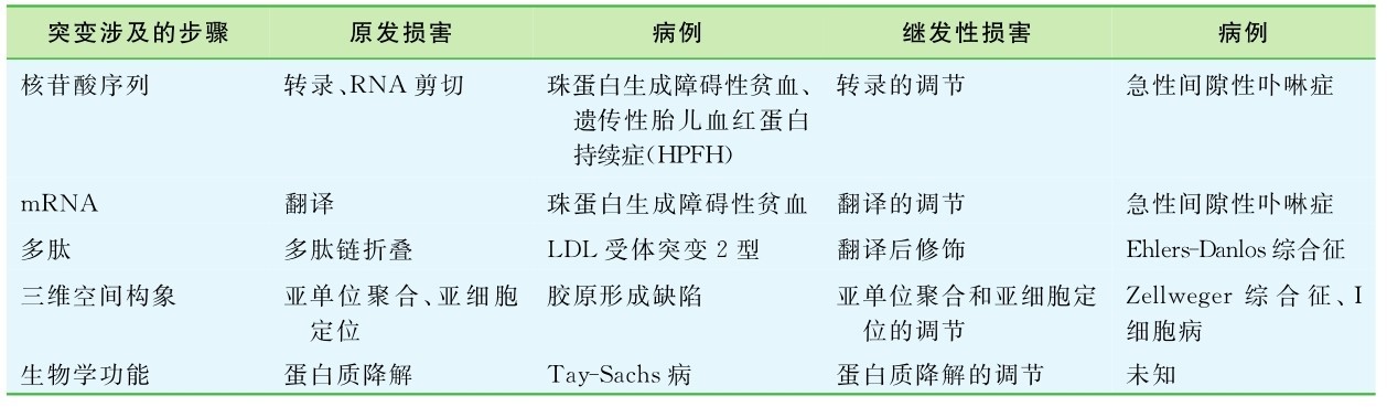 遗传信息通过转录、翻译从基因传到多肽链,后者再形成具有生物学活性的蛋白质。基因突变后,大多从两个途径改变了这些正常蛋白的合成,形成突变蛋白:①突变改变了多肽链的氨基酸序列(即蛋白质的一级结构),使蛋白质失去正常功能,此称为原发性损害(primary abnormalities);②突变并不直接影响某一蛋白质,而是通过干扰多肽链的合成过程(如参与蛋白质翻译的各种因子的突变)、翻译后修饰(如各种参与蛋白质成熟过程的修饰因子的突变),以及蛋白质与辅助因子结合的改变而间接地使某一功能蛋白质失去正常的生物学活性而引起疾病,称为继发性损害(secondary abnormalities)(表3-1)。