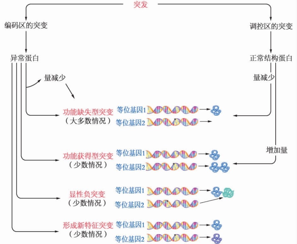 突变对蛋白质功能可产生多种不同的影响(图3-4)。主要包括:①功能缺失型突变;②功能获得型突变;③形成新特征突变;④显性负突变;⑤异时或异位基因表达。
