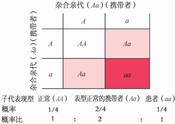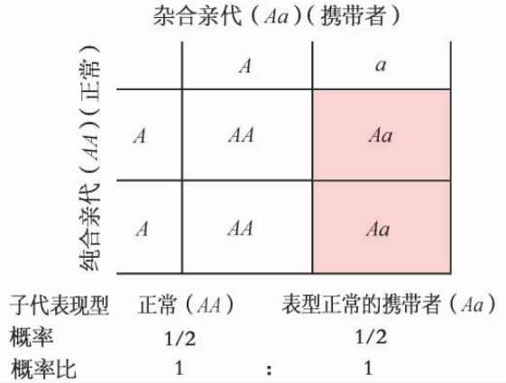 实际上,人群中最多的婚配类型应该是杂合子与正常人婚配(Aa×AA),子代表现型全部正常,但其中将有1/2是携带者(图4-6)。