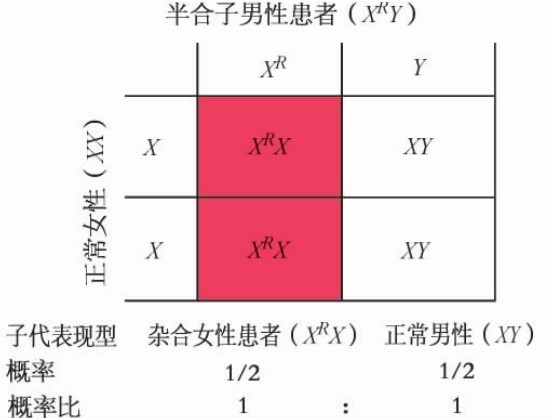 半合子男性患者(XRY)与正常女性(XX)婚配。由于男性患者的X染色体一定传递给女儿,因此女儿都将是患者,儿子全部正常(图4-11)。
