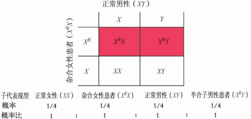图4-10 X连锁显性遗传病杂合女性患者与正常男性婚配图解