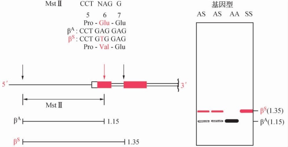本病主要分布在非洲,也散发于地中海地区,在东非某些地区Hb S基因频率高达40%。因此镰状细胞贫血症成为世界范围内最严重的血红蛋白病。Saiki等于1986年将PCR技术首先应用于镰状细胞贫血症的基因诊断并获得成功(图5-6),标志着对于镰状细胞血红蛋白和其他血红蛋白疾病的基因诊断进入了一个新的时期。