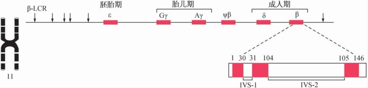人的类β珠蛋白基因簇定位于11p15.5(OMIM#141900),按5′→3′方向排列顺序为:5′-ε-Gγ-Aγ-ψβ1-δ-β-3′(图5-3),总长度为60kb。每条11号染色体只有1个β基因(正常人的β基因用βA表示),正常的二倍细胞有2个β基因。类β珠蛋白基因的排列先后与发育过程的表达顺序相关,发育早期是5′端ε、γ基因表达,成人期主要为3′端β基因表达。