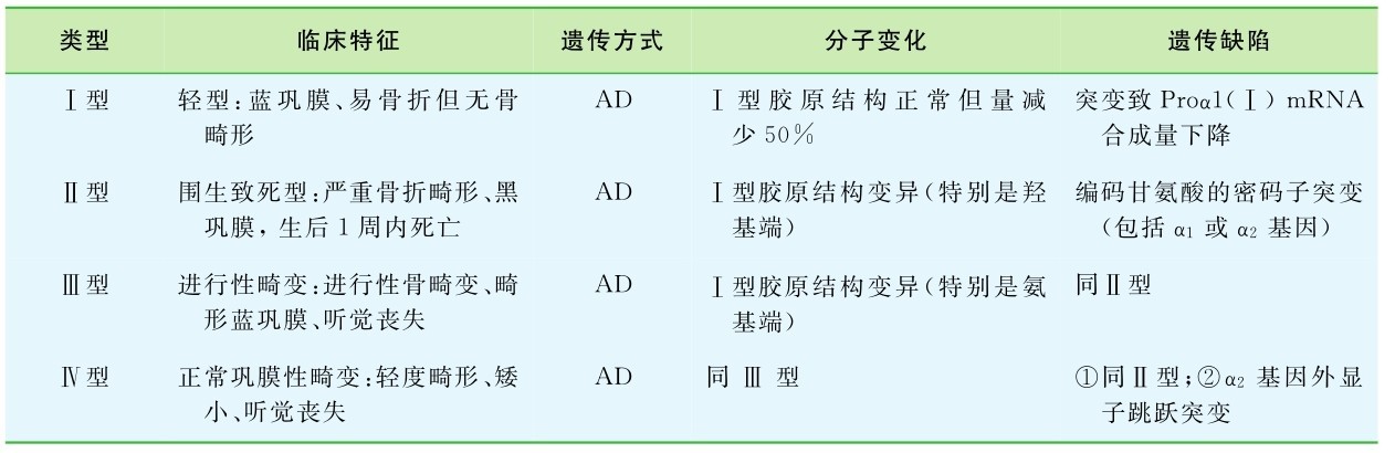 1.成骨不全 成骨不全(osteogenesis imperfecta,OMIM#166200)是一组因Ⅰ型胶原异常而引起的遗传异质性疾病,患者表现为骨质疏松、易骨折并伴有骨骼畸形等症状。该病的患病率约为1/15 000,是最常见的一种常染色体显性遗传病。成骨不全有多种类型,较常见的是Ⅰ型和Ⅱ型成骨不全(表5-2)。