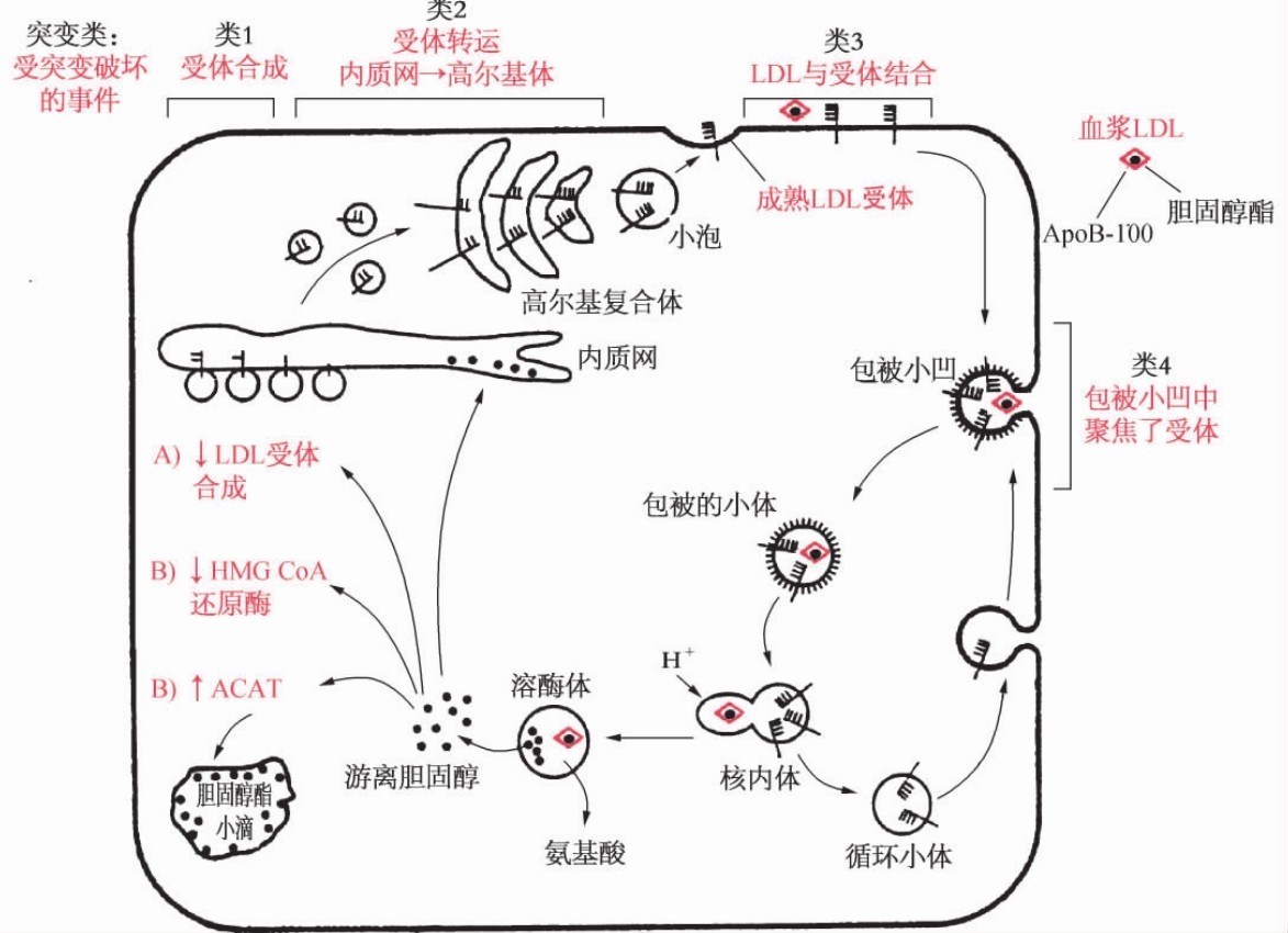 家族性高胆固醇血症为遗传性高脂蛋白血症中的一个类型,遗传性高脂蛋白血症患者血浆中的胆固醇和三酰甘油(甘油三酯)增高,从而导致冠心病、心肌梗死等心血管疾病。家族性高胆固醇血症是由于细胞膜上的LDL受体缺陷而致病。在正常情况下,LDL与细胞膜上的LDL受体结合,通过内吞作用进入细胞,被溶酶体吞噬,为溶酶体酸性水解酶水解,释放出游离胆固醇。游离胆固醇在细胞内可激活脂酰辅酶A,将游离胆固醇脂化;游离胆固醇同时可抑制细胞内的β-羟基-β-甲基戊二酰辅酶A还原酶,从而减少细胞内胆固醇的合成。该病患者由于LDL受体缺陷,致使血浆中的LDL不能进入细胞,并使细胞内胆固醇的反馈抑制解除,使细胞内胆固醇合成增加并进入血浆,加重血浆中胆固醇的堆积(图5-8)。