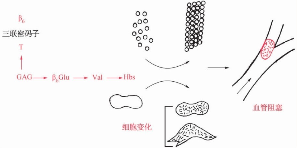 1.镰状细胞贫血症(镰状细胞血红蛋白) 镰状细胞贫血症(sickle cell anemia,OMIM#603903)是因β珠蛋白基因缺陷所引起的一种疾病,呈常染色体隐性遗传。患者β珠蛋白基因的第6位密码子由正常的GAG突变为GTG(A→T),使其编码的β珠蛋白N端第6位氨基酸由正常的谷氨酸变成了缬氨酸,形成血红蛋白S(Hb S)。这种血红蛋白分子表面电荷改变,出现一个疏水区域,导致溶解度下降。在氧分压低的毛细血管中,溶解度低的Hb S聚合形成凝胶化的棒状结构,使红细胞变成镰刀状。镰变细胞引起血黏性增加,易使微细血管栓塞,造成散发性的组织局部缺氧,甚至坏死,产生肌肉骨骼痛、腹痛等痛性危象。同时镰状细胞的变形能力降低,通过狭窄的毛细血管时,不易变形通过,挤压时易破裂,导致溶血性贫血(图5-5)。杂合子(Hb A/Hb S)不表现临床症状,但在氧分压低时可引起部分细胞镰变。
