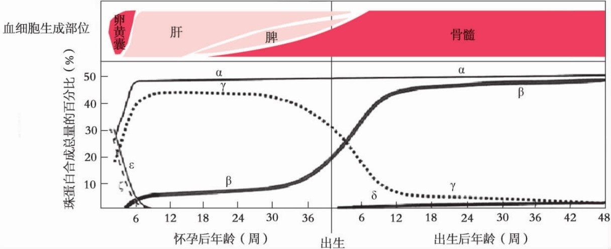 图5-4 人体不同发育时期珠蛋白基因的表达