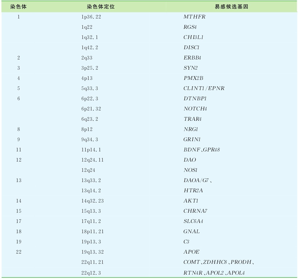 除上述4类基因外,被怀疑为精神分裂症易感基因(候选区)的基因如表7-1所示。
