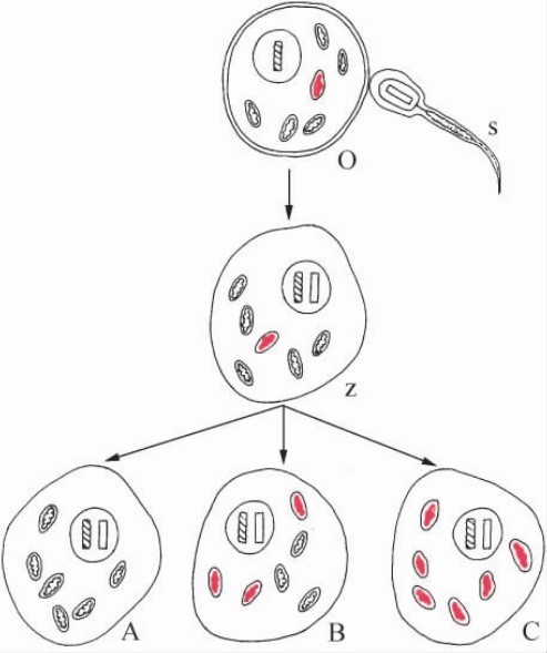 O:卵细胞;S:精子;A、B、C:子代细胞。(涂黑的为突变线粒体)
