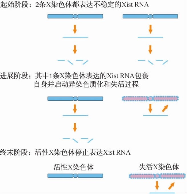近年来的研究发现,X染色体失活可能由X染色体上所存在的Xic基因X染色体失活中心(X-inactivation centre)及其X染色体失活特异转录物(X-inactive-specific transcript) Xist决定(图10-4)。