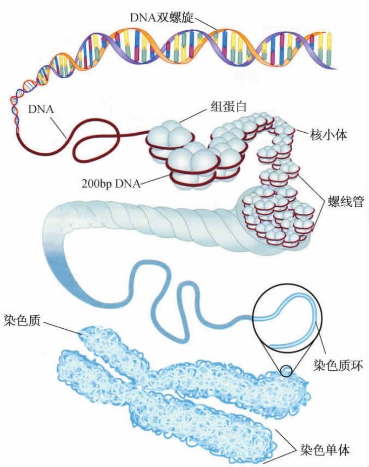 染色质(chromatin)和染色体实质上是同一物质在不同细胞周期、执行不同生理功能时不同的存在形式。在细胞从间期到分裂期过程中,染色质通过螺旋化凝缩(condensation)成为染色体,而在细胞从分裂期到间期过程中,染色体又解螺旋舒展成为染色质。
